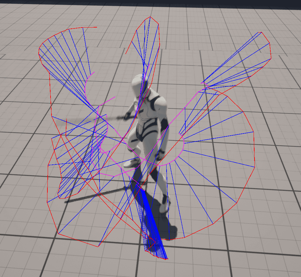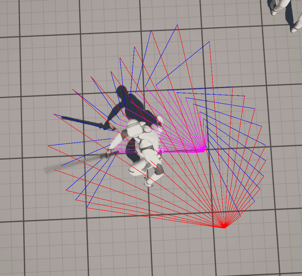파란색 선분이 CurrentTraceStart - CurrentTraceEnd 트레이싱 결과고, 핑크색이 PreviousTraceStart - CurrentTraceStart 트레이싱 결과, 빨간색이 PreviousTraceEnd - CurrentTraceEnd 트레이싱 결과다 AI한테 물어봤을 때 파란색 선분 없이 핑크색이랑 빨간색만 나오게 만들어서 파란색은 내가 추가함