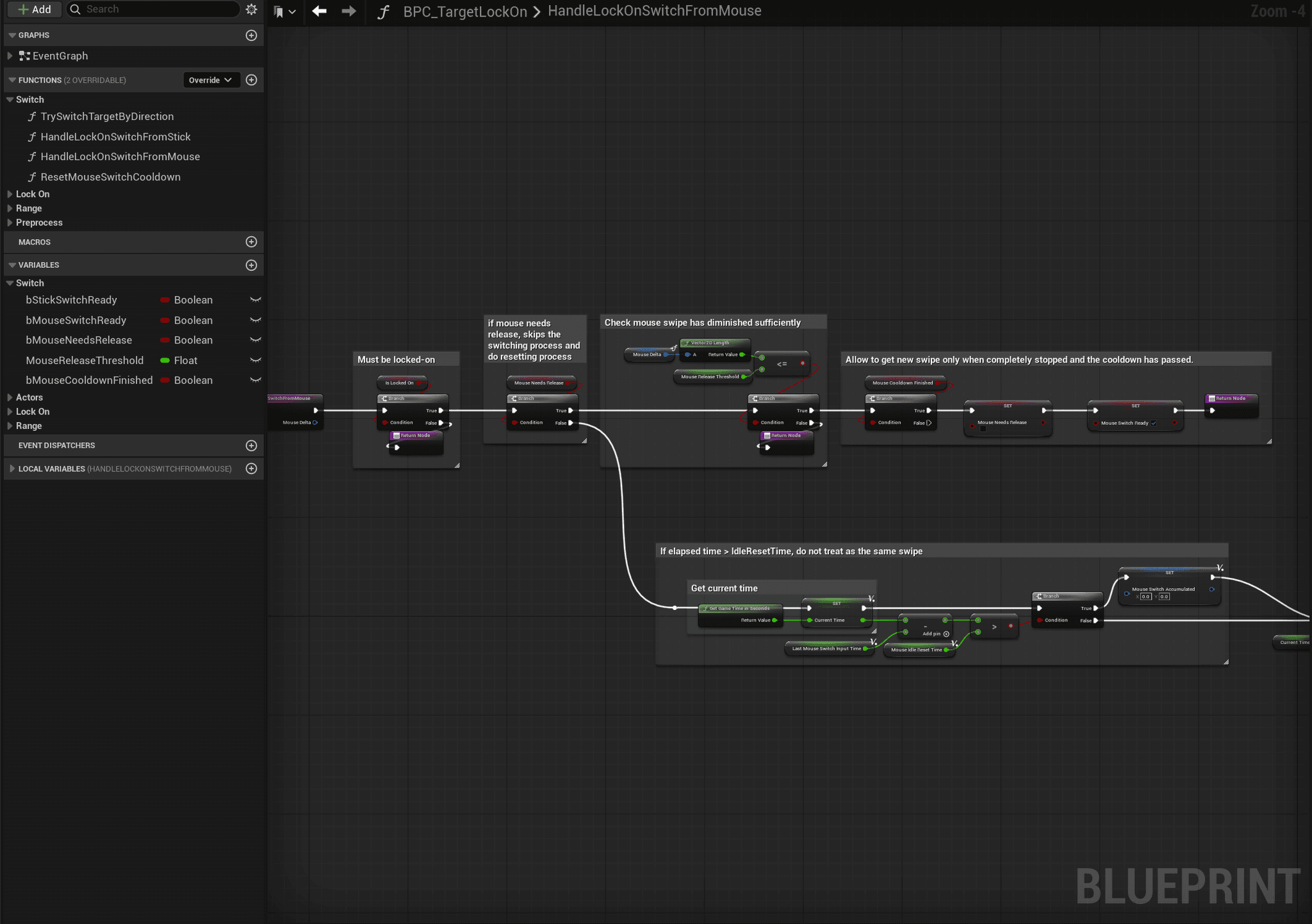 다만 조금 더 정제된 노하우가 필요하다는 생각은 들었다. 체력/스테미너/이동속도 등 스탯 관련 정보, 공격 등에 대한 메타데이터를 일일이 지역 변수로 떡칠하기보다 데이터 자료(DataAsset) 형태로 관리를 하게 한다던지, 개발 생산성을 위한 구조 설계와 재사용성을 위한 로직 분리 부분에서 나름대로 노력하였으나 직접적인 효능감을 느끼지는 못했다.