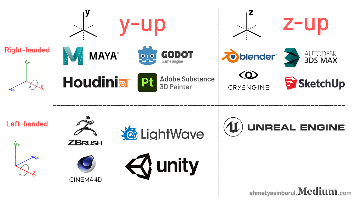 왼손 오른손에 유불리는 없다 z-up 장점: 물리 계산 편함((역)기구학(inverse-kinematics): A동작에서 B동작으로 움직이게 하고 싶을 때 역계산) y-up 장점: 인간에게 편함