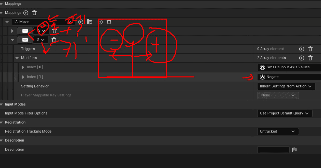 키보드 입력은 조이스틱처럼 부호를 알 수 없으므로(digital) Negate Modifier를 처리해줘야함