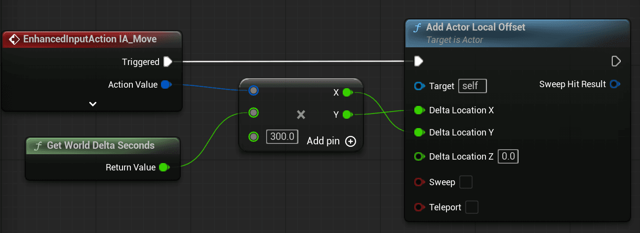 BP_Pawn EventGraph에서 인풋 액션의 입력값을 XY축 교차하여 오프셋 변경 노드(Add Actor Local Offset)에 연결시켜줌