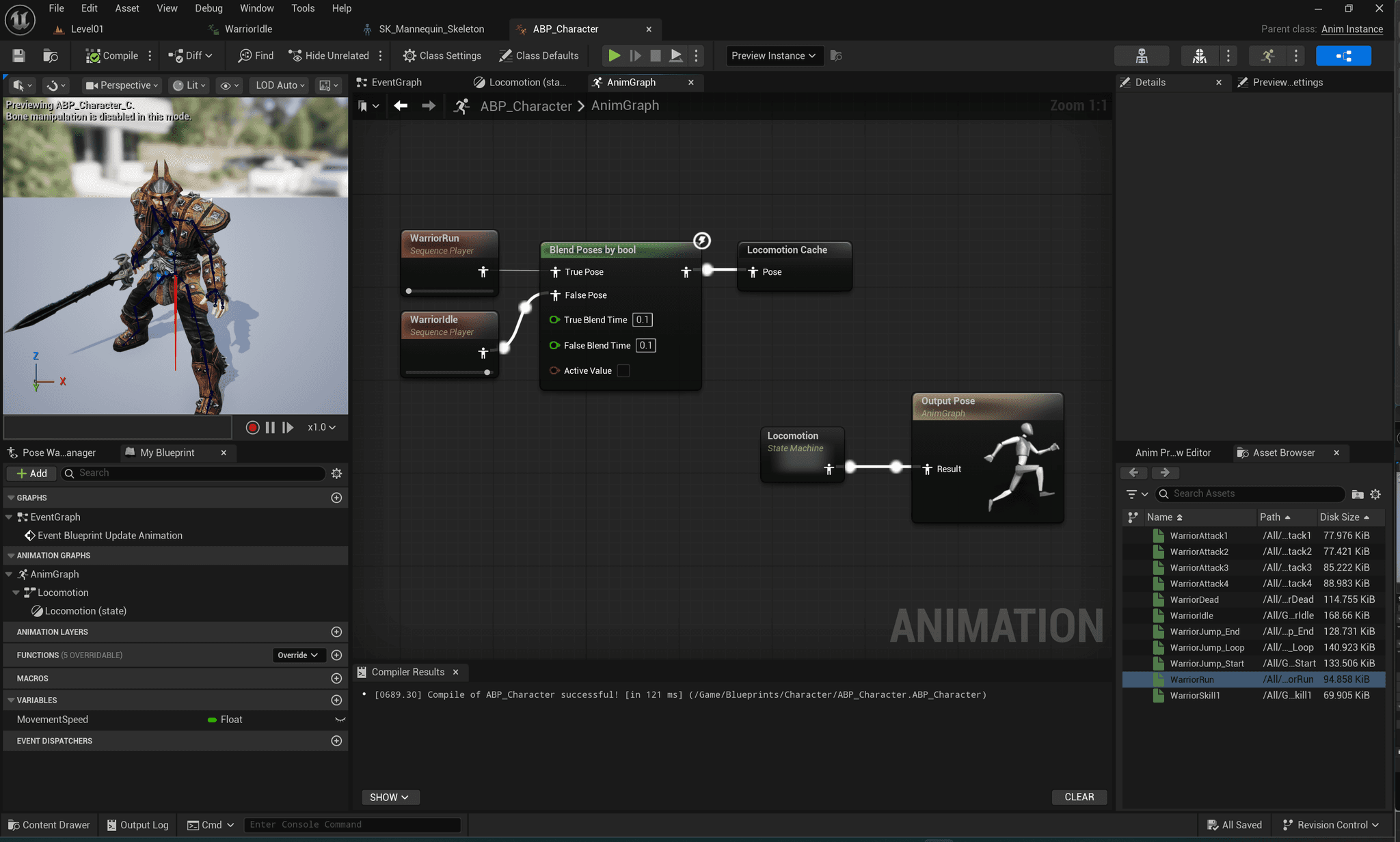 Blend Poses by bool로 연결, Locomotion Cache(State Machine) 노드로 연결 - MovementSpeed 변수 하나 생성해서 Greater로 Active Value에 연결 Locomotion(운동) State machine