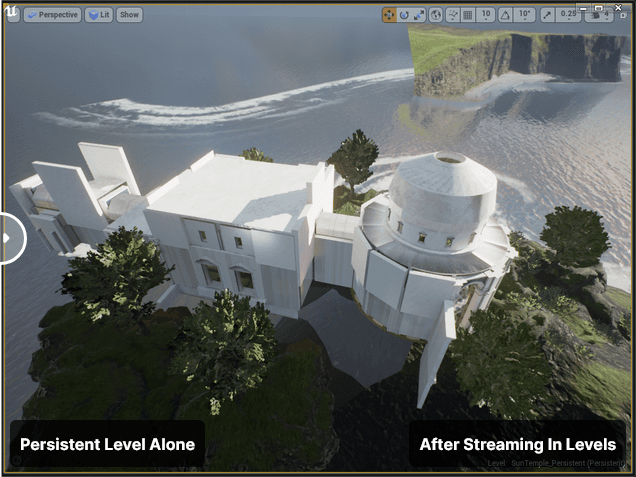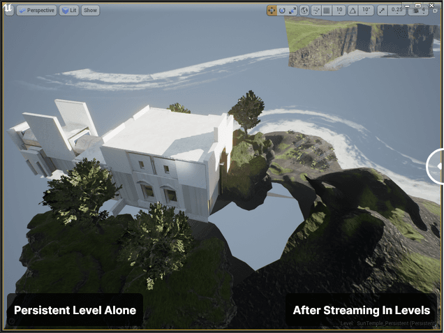 레벨 스트리밍 기능을 사용하면 플레이 중에 맵 파일을 메모리에 로드하고 언로드할 수 있을 뿐 아니라 비저빌리티를 토글할 수도 있습니다. 이를 통해 월드를 더 작은 청크로 쪼개어 월드의 관련 부분만 리소스를 차지하게 하고 언제든지 렌더링되도록 할 수 있습니다. 레벨 스트리밍을 제대로 수행하면 플레이어가 월드 내에서 자신이 아주 작은 모습으로 플레이하는 듯이 느낄 수 있는 끊김없는 대형 게임을 만들 수 있습니다.