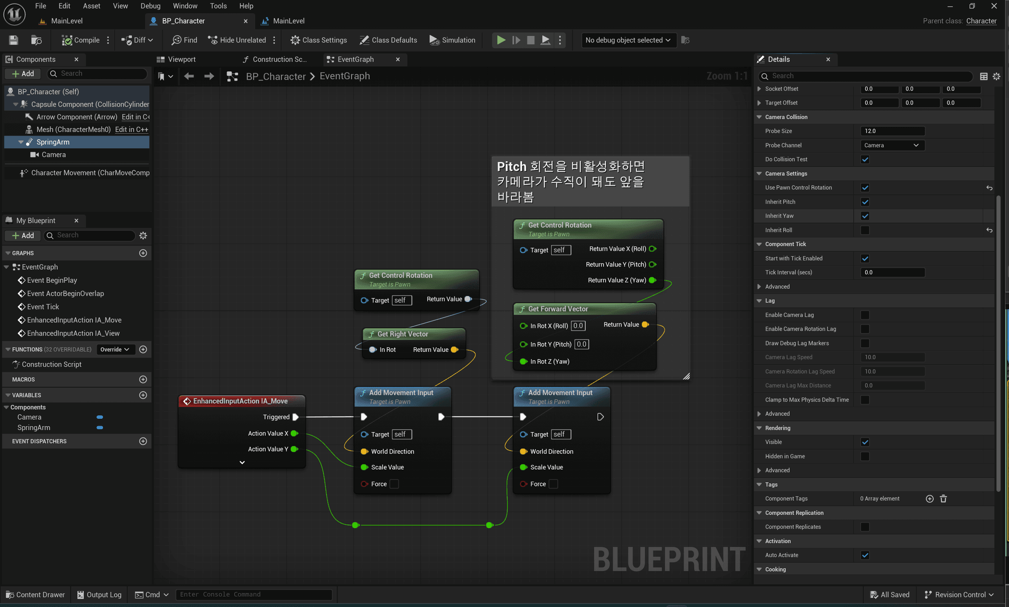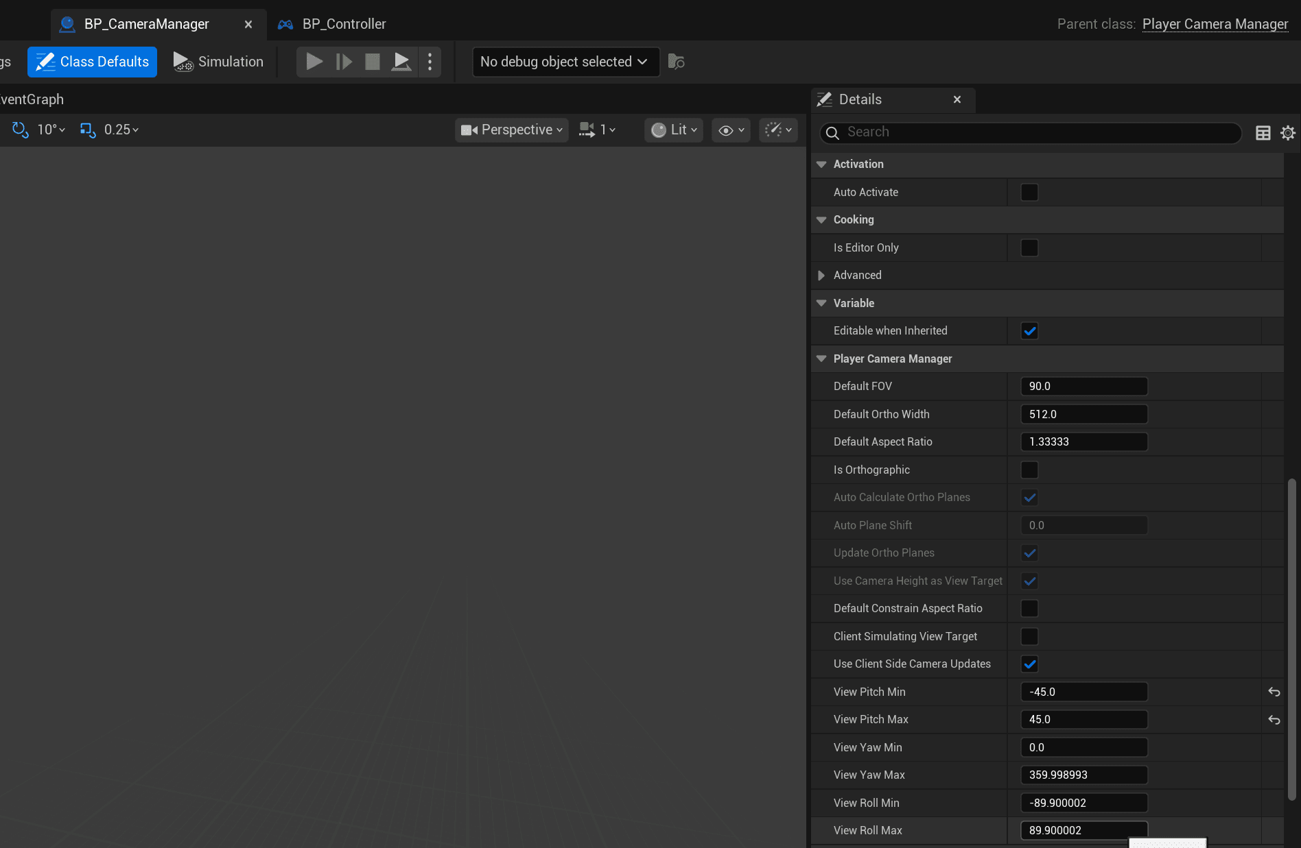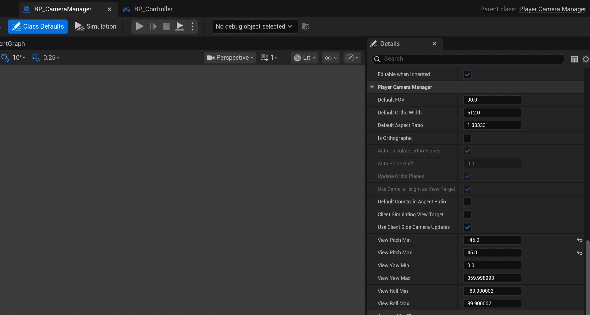 - 좌우 드래그는 제한없지만 상하 드래그는 제한할 수 있다. 그것을 PlayerCameraManager→Player Camera Manager 옵션에서 제한할 수 있다