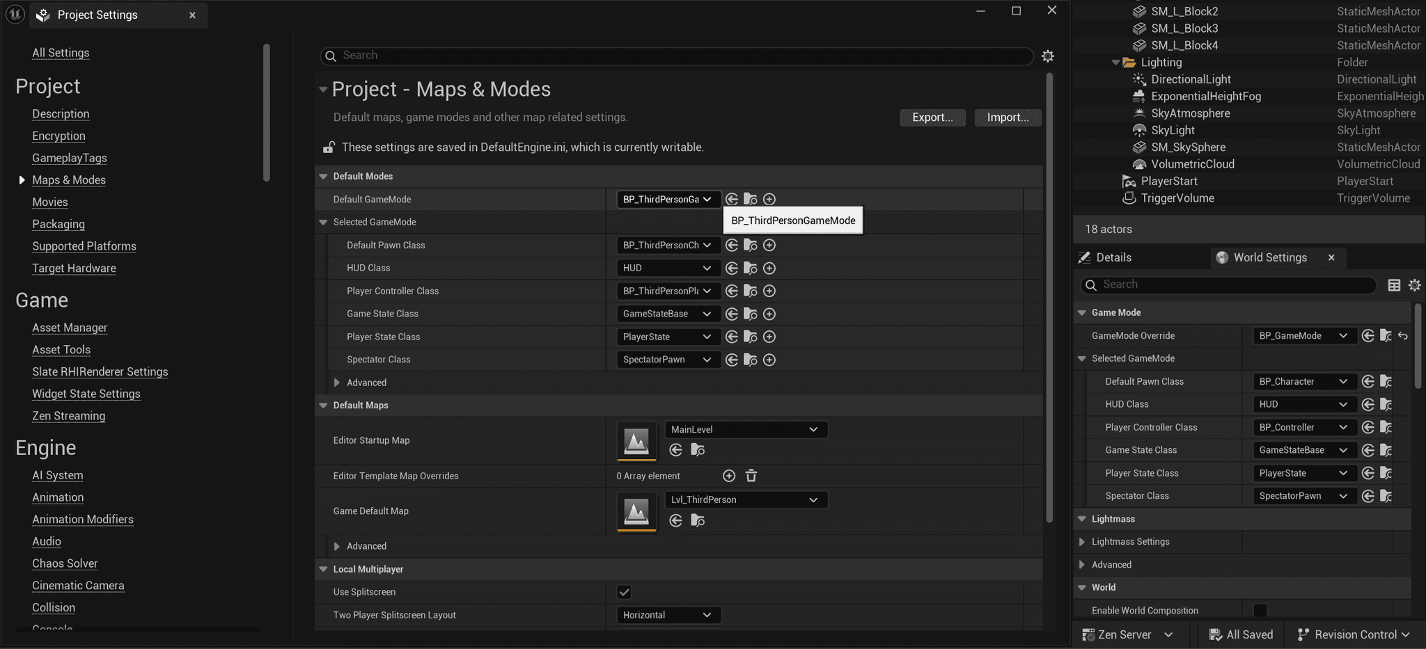 기본 게임 모드 설정이 있고 각 월드마다 게임모드를 덮어씌울 수 있다(override)