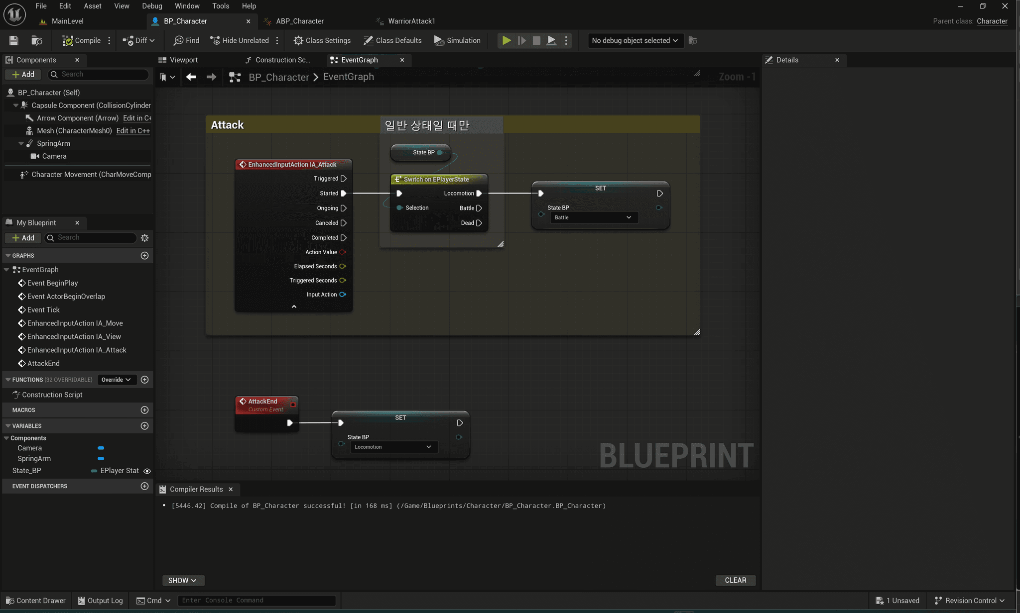 - attack이 끝날 때 다시 locomotion 상태로 전환해줘야 한다(종료 조건) Custom Event 연결하기