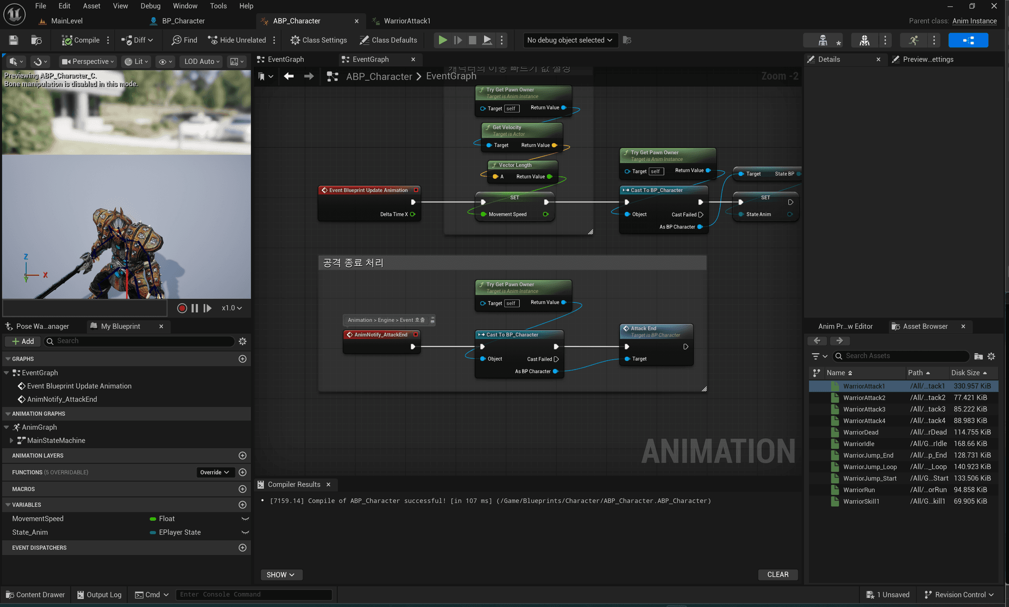 - Event Graph에서 설정된 MovementSpeed가 조건에 따라 AnimGraph에서 어떤 애니메이션을 블랜딩할지 결정하는거임임