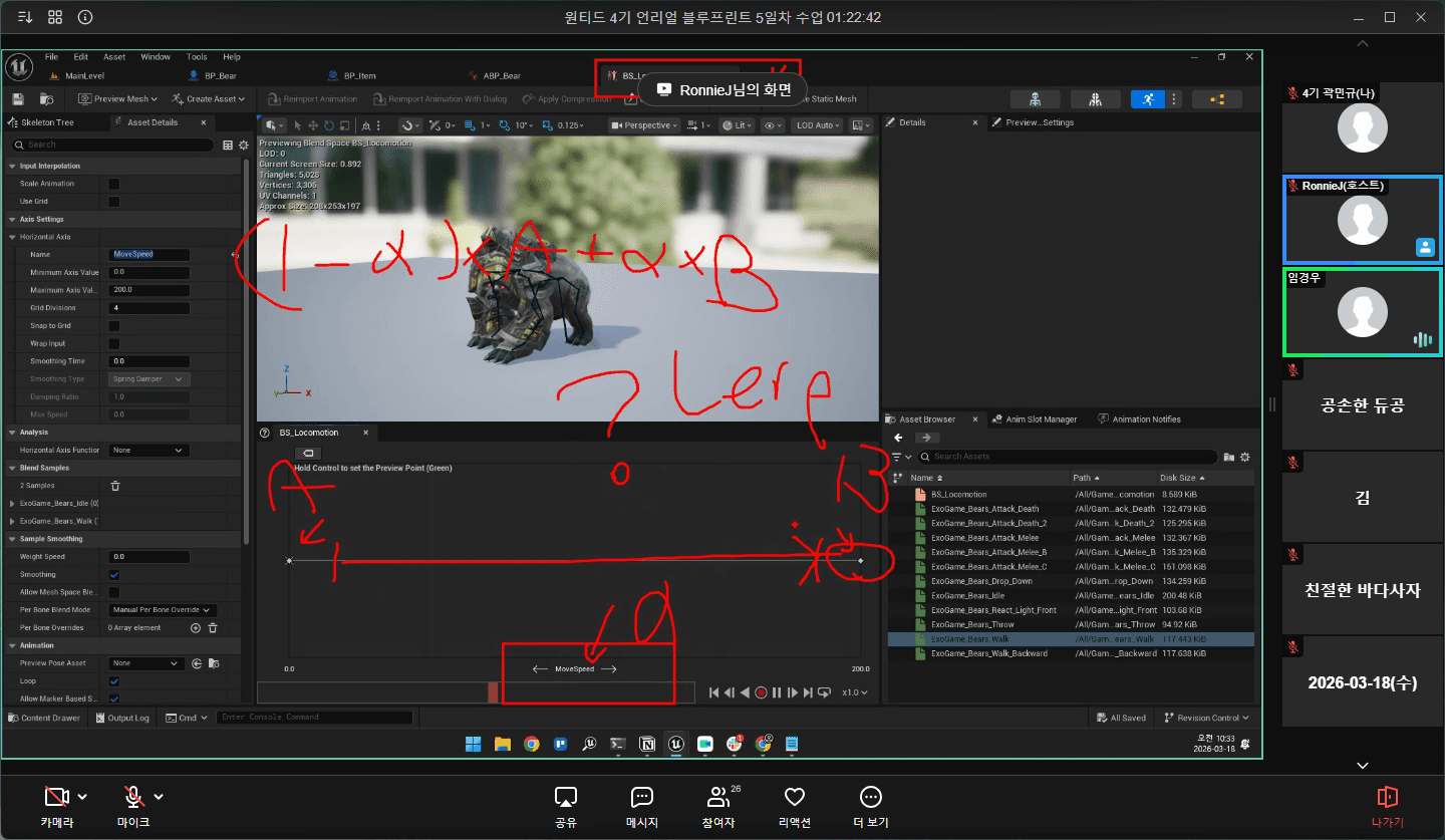 Blend Space: 두 애니메이션을 섞는 기능. 보간으로 섞음