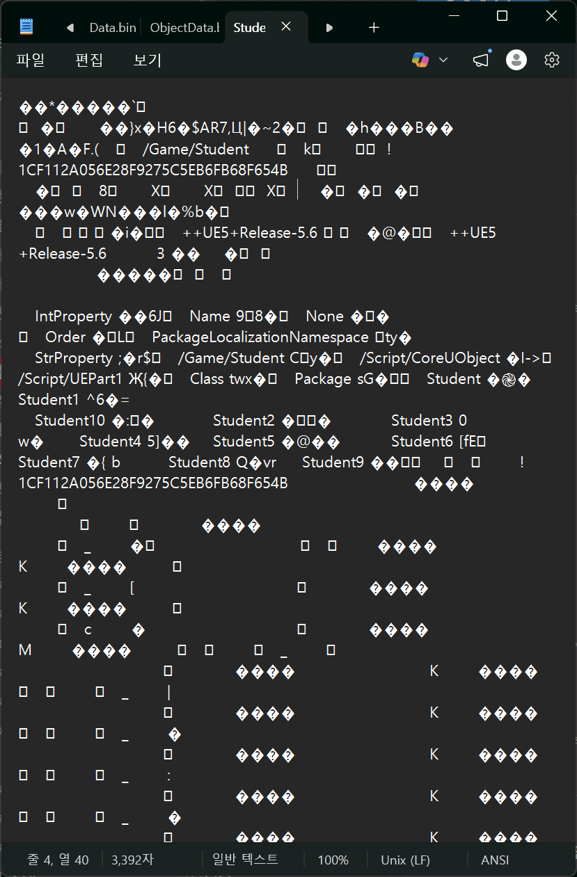 // 서브 오브젝트 추가const int32 SubObjectCount = 10;for (int32 i = 1; i <= SubObjectCount; ++i){ FString SubObjectName = FString::Printf(TEXT("Student%d"), i); UStudent* SubStudent = NewObject<UStudent> ( Student, UStudent::StaticClass(), *SubObjectName, ObjectFlag ); SubStudent->SetName(FString::Printf(TEXT("학생%d"), i)); SubStudent->SetOrder(i);}- 구조: 패키지 → 애셋 → 서브오브젝트