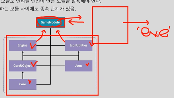 - 모든 모듈들이 GameModule에 포함되고, GameModule을 언리얼이 가져가서 exe로 만듦