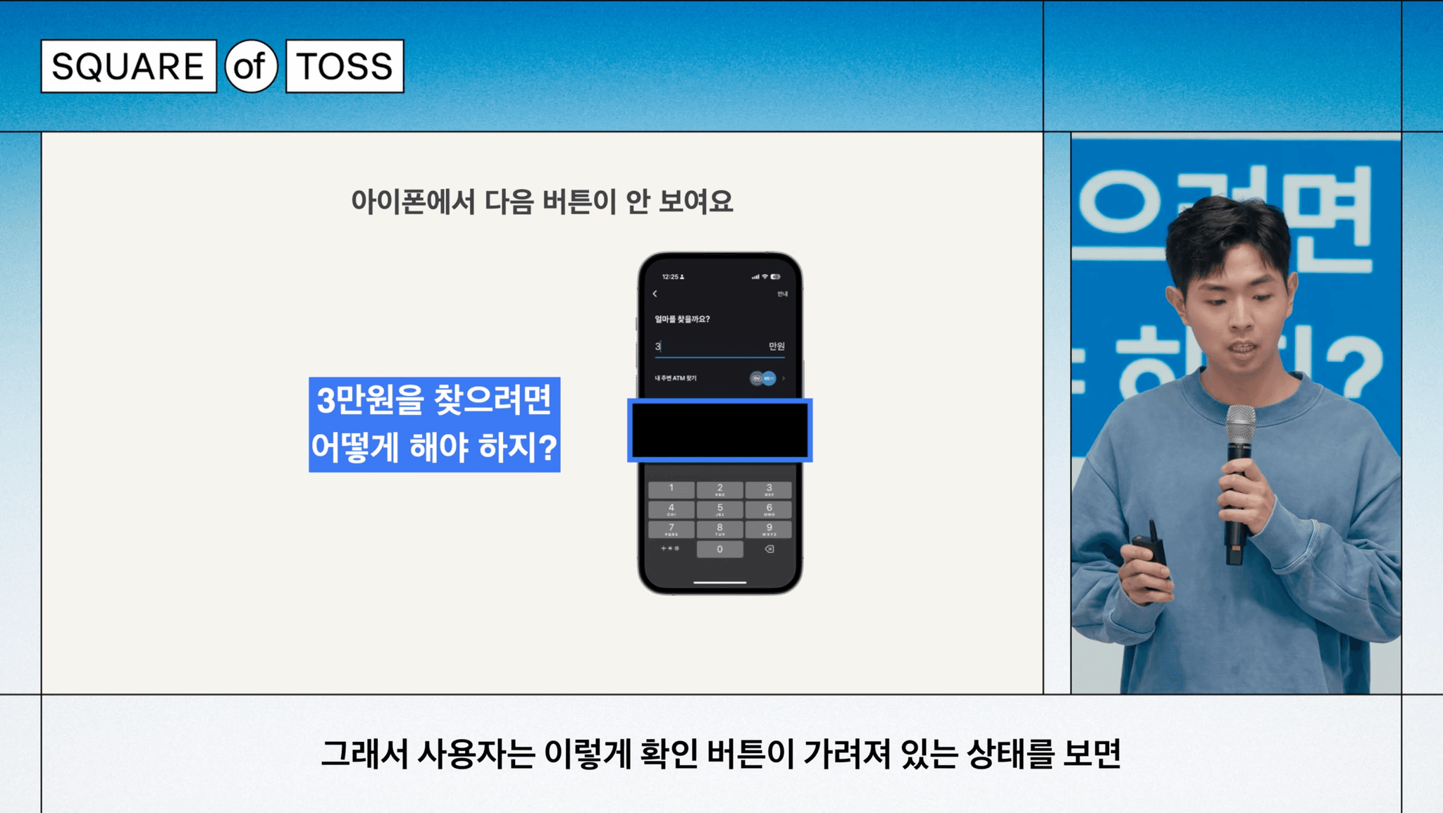 이렇게 주변 사람들이 어떤 말을 더 자주 하냐가 사실 개발자 개인의 마음가짐에 큰 영향을 주는 것 같습니다. 그래서 토스에서의 문화를 보여주는 예시 하나를 소개드리고 싶어요. 토스에는 ATM 현금 찾기라고 하는 제품이 있습니다. 처음에 진입을 하면 얼마를 찾을지를 입력해야 되는데요, 금액을 입력하기 위해 아이폰에서 금액 입력 인풋을 누르면 이상한 일이 벌어지고는 했습니다. 원래 화면에 가장 아래에 있던 '확인'이라고 하는 버튼이 갑자기 키보드에 가려져 사라지는 거죠. 그래서 금액을 입력하고 확인 버튼을 보려면 없고, 버튼을 보려고 하면 화면을 탭해서 키보드를 내려야 됩니다.