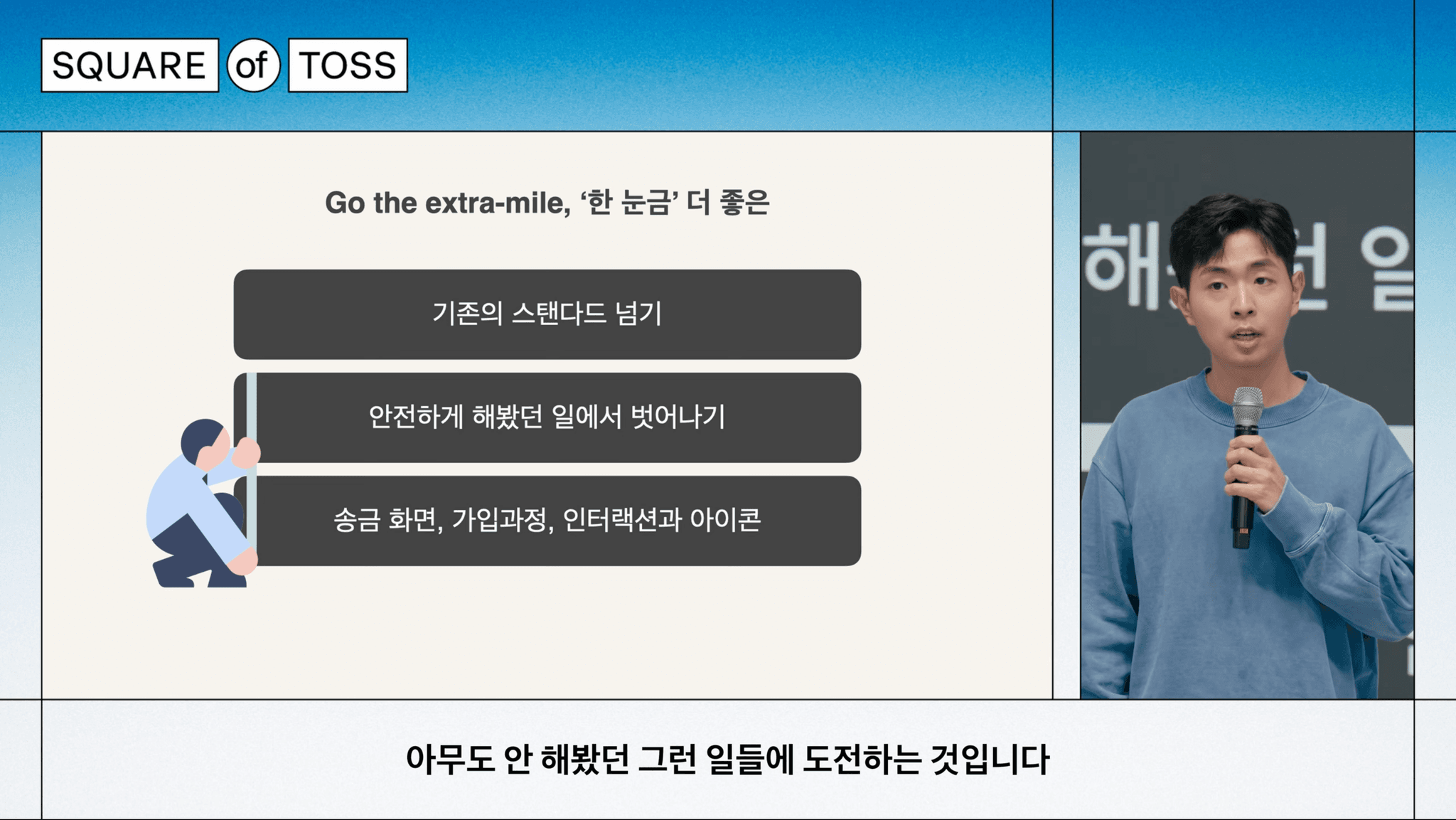 그래서 이런 모습을 토스의 코어 벨류에선 'Go the extra-mile' 이라고 합니다. 뇌에 힘을 빼고도 할 수 있는, 안전하게 할 수 있는 일에서 벗어나서, 기존의 스탠다드를 넘어서 실질적인 문제 해결을 위해 아무도 안해봤던 일들에 도전하는 것입니다.