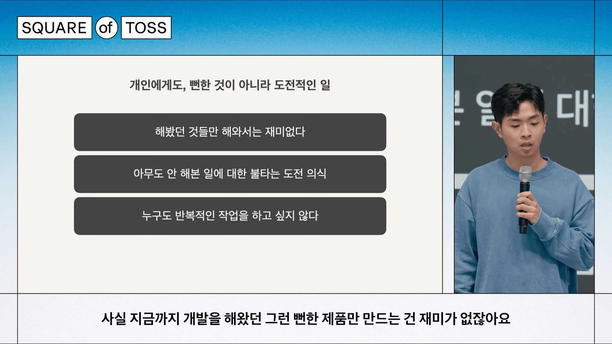 단적인 예로 토스의 송금 제품이라고 하면요, 토스의 대표 제품이고 천만 명이 넘는 사람들이 매일매일 사용하고 있지만 여전히 더 편리한 사용성을 위해 새로운 시도들을 이어가고 있습니다. 그래서 이런 환경 속에서 이런 문제에 대해서 이슈를 던지니까 오래 걸려서라도 해결할 수 있는 시간이 주어졌습니다.