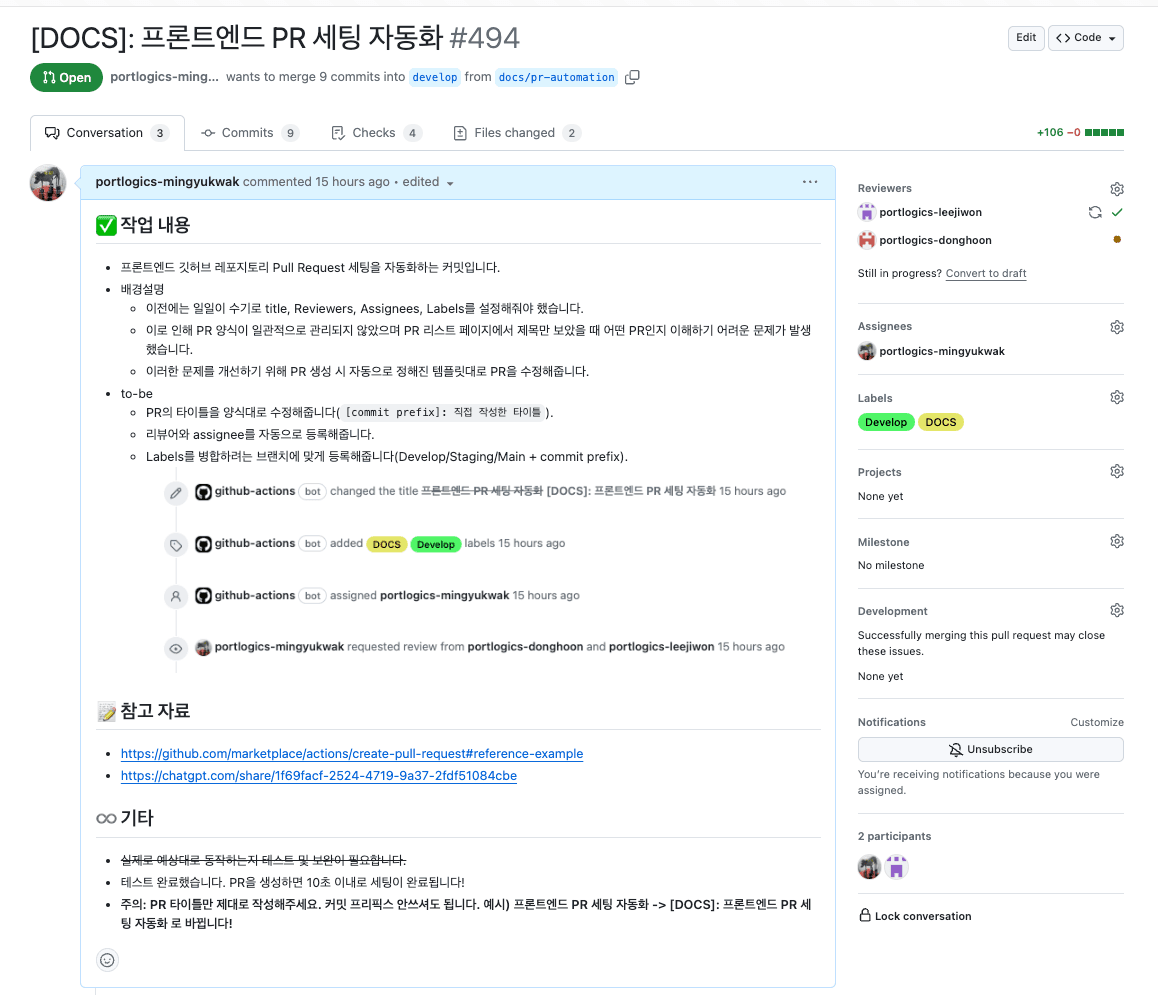 name: Auto PR Settingson: pull_request: types: [opened]permissions: contents: read pull-requests: write issues: write repository-projects: read statuses: read checks: readjobs: updatePullRequest: runs-on: ubuntu-latest steps: - name: Check out the repository uses: actions/checkout@v4 with: ref: ${{ github.event.pull_request.head.ref }} - name: Make changes to pull request run: date +%s > report.txt - name: Get branch names id: branch-names uses: tj-actions/branch-names@v8 - name: Get branch prefix id: get_branch_prefix if: steps.branch-names.outputs.is_default == 'false' run: | PREFIX=$(echo ${{ steps.branch-names.outputs.current_branch }} | awk -F'/' '{print toupper($1)}') echo "prefix=$PREFIX" >> $GITHUB_OUTPUT - name: Determine label based on base branch id: get_label run: | BASE_BRANCH=${{ github.event.pull_request.base.ref }} PREFIX=${{ steps.get_branch_prefix.outputs.PREFIX }} LABELS=() # Add the prefix as a label LABELS+=("$PREFIX") # Add the label based on the base branch if [[ "$BASE_BRANCH" == "develop" ]]; then LABELS+=("Develop") elif [[ "$BASE_BRANCH" == "staging" ]]; then LABELS+=("Staging") elif [[ "$BASE_BRANCH" == "main" ]]; then LABELS+=("Main") else LABELS+=("Unknown") fi # Join the labels with a comma LABEL_STRING=$(IFS=, ; echo "${LABELS[*]}") echo "labels=$LABEL_STRING" >> $GITHUB_OUTPUT - name: Select reviewers id: select_reviewers run: | ALL_REVIEWERS=("portlogics-mingyukwak" "portlogics-donghoon" "portlogics-leejiwon") ACTOR="${{ github.actor }}" SELECTED_REVIEWERS=() for REVIEWER in "${ALL_REVIEWERS[@]}"; do if [ "$REVIEWER" != "$ACTOR" ]; then SELECTED_REVIEWERS+=("$REVIEWER") fi done echo "reviewer1=${SELECTED_REVIEWERS[0]}" >> $GITHUB_OUTPUT echo "reviewer2=${SELECTED_REVIEWERS[1]}" >> $GITHUB_OUTPUT - name: Update PR title and body run: | gh pr edit ${{ github.event.pull_request.number }} \ --title "[${{ steps.get_branch_prefix.outputs.prefix }}]: ${{ github.event.pull_request.title }}" \ --body "${{ github.event.pull_request.body }}" env: GH_TOKEN: ${{ secrets.GITHUB_TOKEN }} - name: Add labels to PR run: | gh pr edit ${{ github.event.pull_request.number }} \ --add-label ${{ steps.get_label.outputs.labels }} env: GH_TOKEN: ${{ secrets.GITHUB_TOKEN }} - name: Add assignees to PR run: | gh pr edit ${{ github.event.pull_request.number }} \ --add-assignee ${{ github.event.pull_request.user.login }} env: GH_TOKEN: ${{ secrets.GITHUB_TOKEN }} - name: Add reviewers to PR run: | gh pr edit ${{ github.event.pull_request.number }} \ --add-reviewer ${{ steps.select_reviewers.outputs.reviewer1 }},${{ steps.select_reviewers.outputs.reviewer2 }} env: GH_TOKEN: ${{ secrets.KWAK_PAT }}