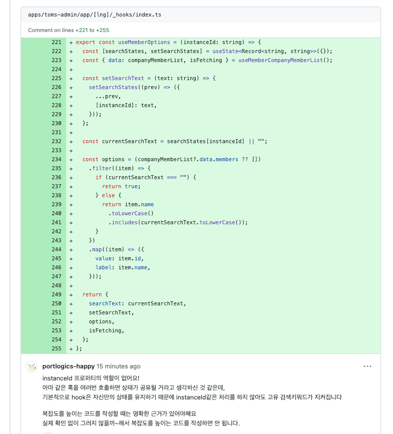 instanceId → searchStates<Record<string, string>> 으로 복잡하게 관리하는 부분이 추가된 지점에 대해 구두리뷰하면서 hook이 한 컴포넌트에 여러번 호출되어야할 때 인스턴스별로 구분짓기 위한 설계라고 설명받았는데, 불필요한 복잡도를 높이는 코드라는 점에 대해 경계하는 태도가 부족했던 것 같다