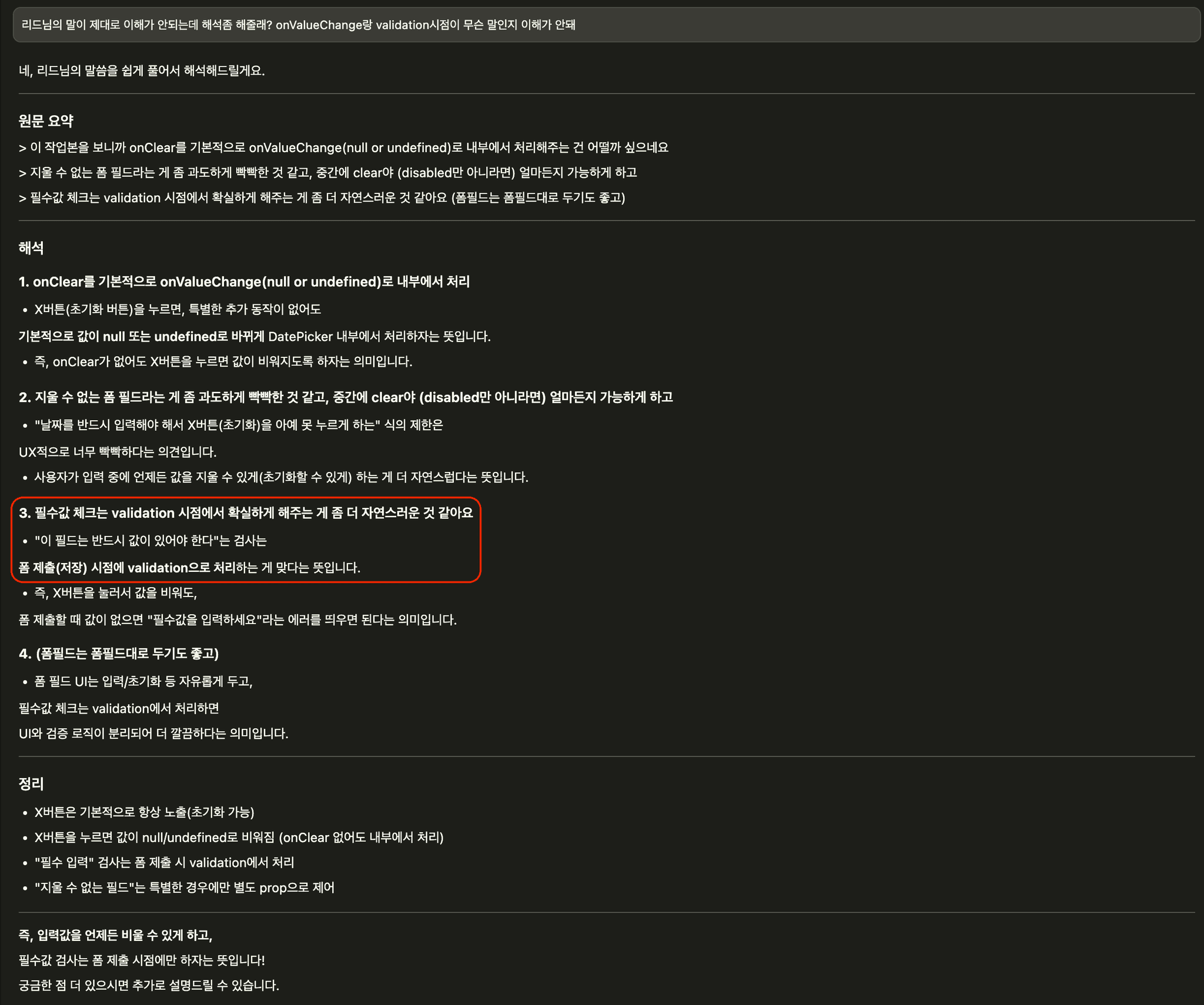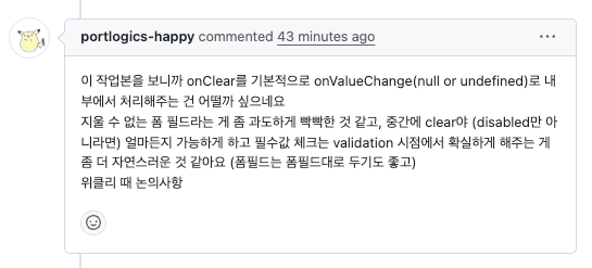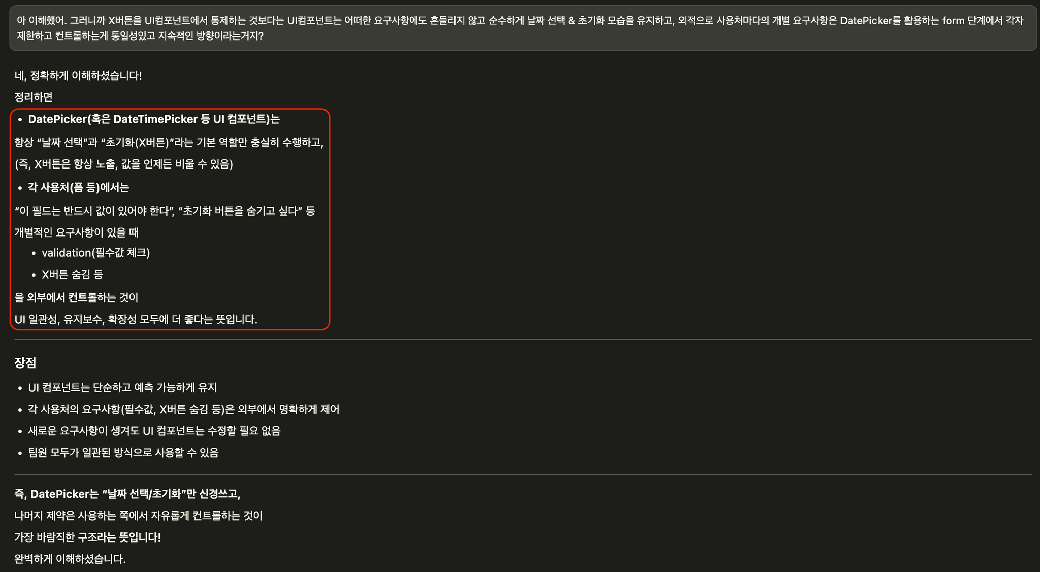 - 모든 DatePicker 구현부에서 의미없는 onClear를 선언해줘야만 X버튼을 노출시킬 수 있는데, X버튼을 숨겨야하는 곳보다 써야하는 곳이 압도적으로 많아 불필요한 코드 양산을 야기함