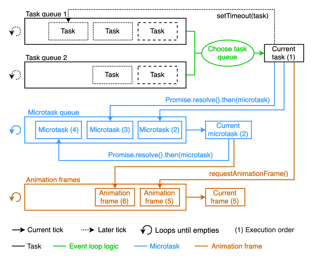 - 브라우저는 task 하나를 처리할 때마다 microtask 전부를 처리하고 렌더링을 수행한다. 그래서 microtask가 모두 처리되기 전까지는 UI 렌더링이나 네트워크 요청은 절대 일어날 수 없다.